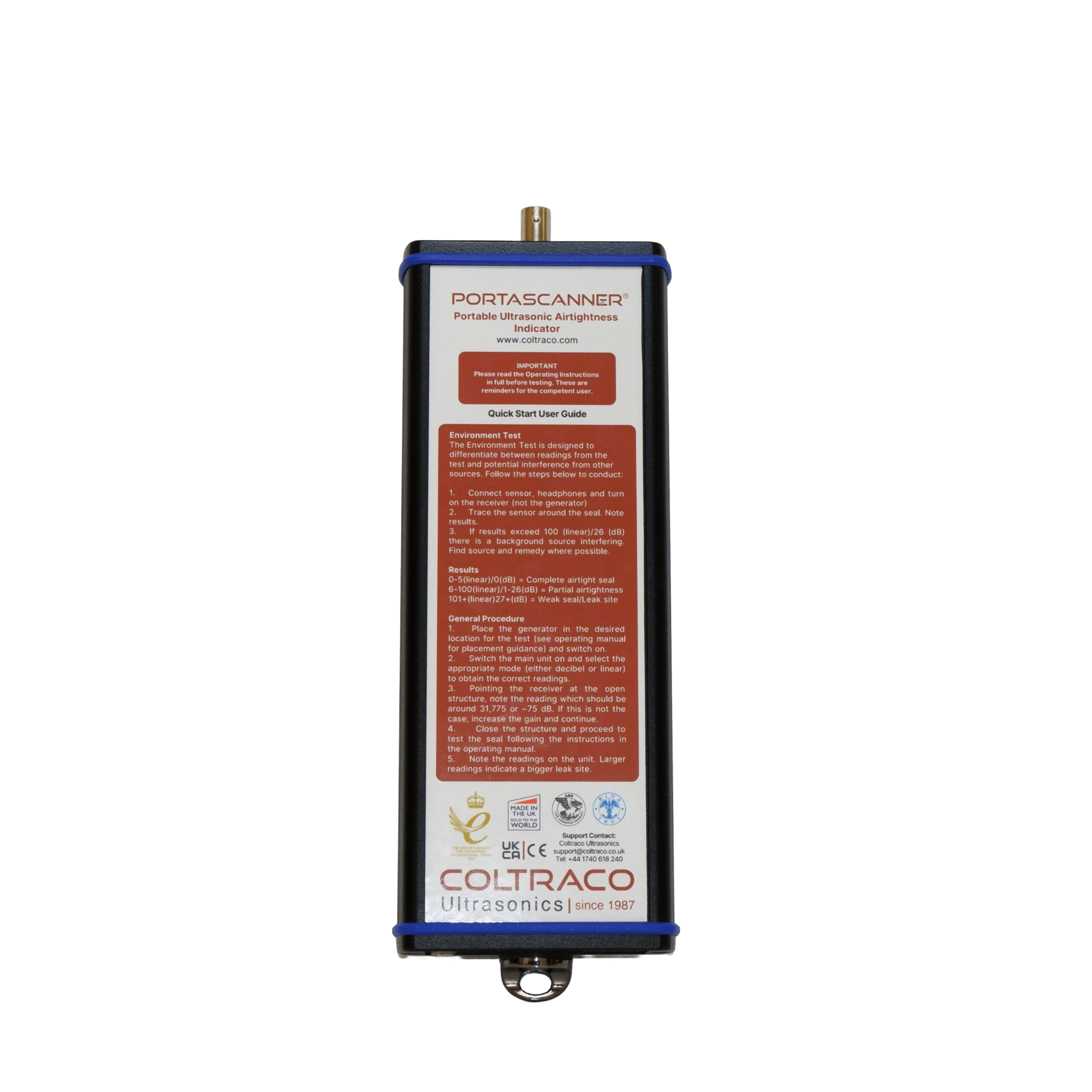 The Portascanner® COVID-19 (supplied with the Portascanner® AIRTIGHT) is a unique ultrasonic technology from Coltraco Ultrasonics capable of identifying the exact location of any leak site within a structure, measuring the physical size of the leak, calculating the airflow rate through it, and estimating the air permeability of the structure or room as a whole.